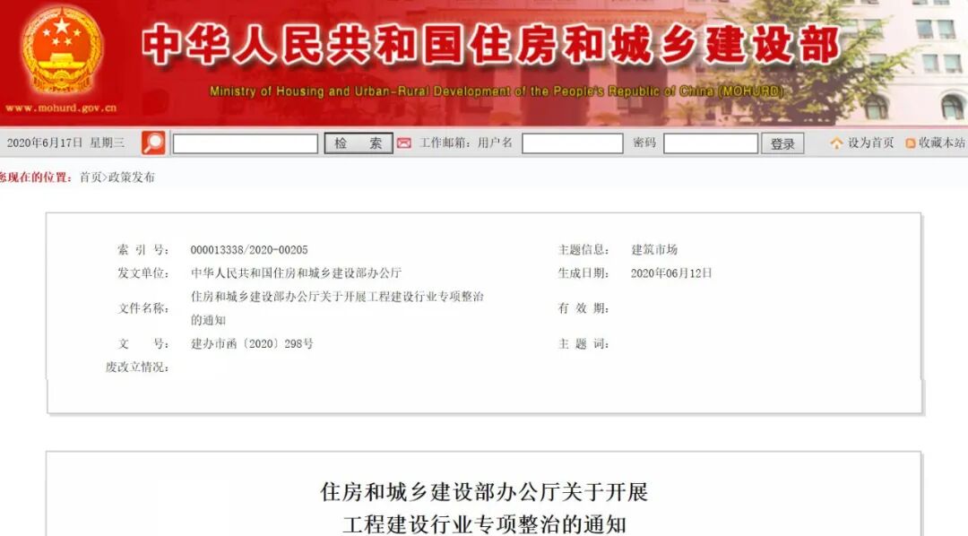 6月17日,住房城乡建设部官网发布通知,为加强对房屋建筑和市政基础设施工程建设活动的监督管理,排查整治突出问题,2020年6月~9月开展为期4个月的工程建设行业专项整治活动,主要聚焦工程建设领域恶意竞标、强揽工程、转包、违法分包、贪污腐败等突出问题。