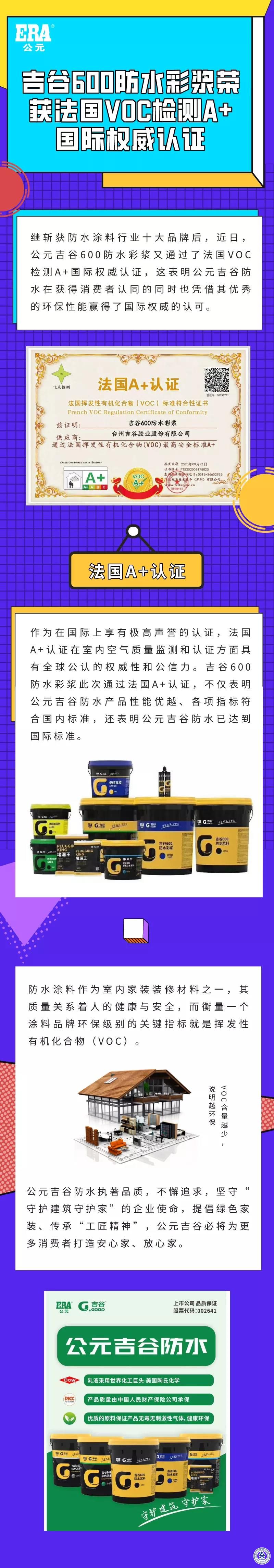 恭喜公元吉谷600防水彩浆荣获法国VOC检测A+国际权威认证