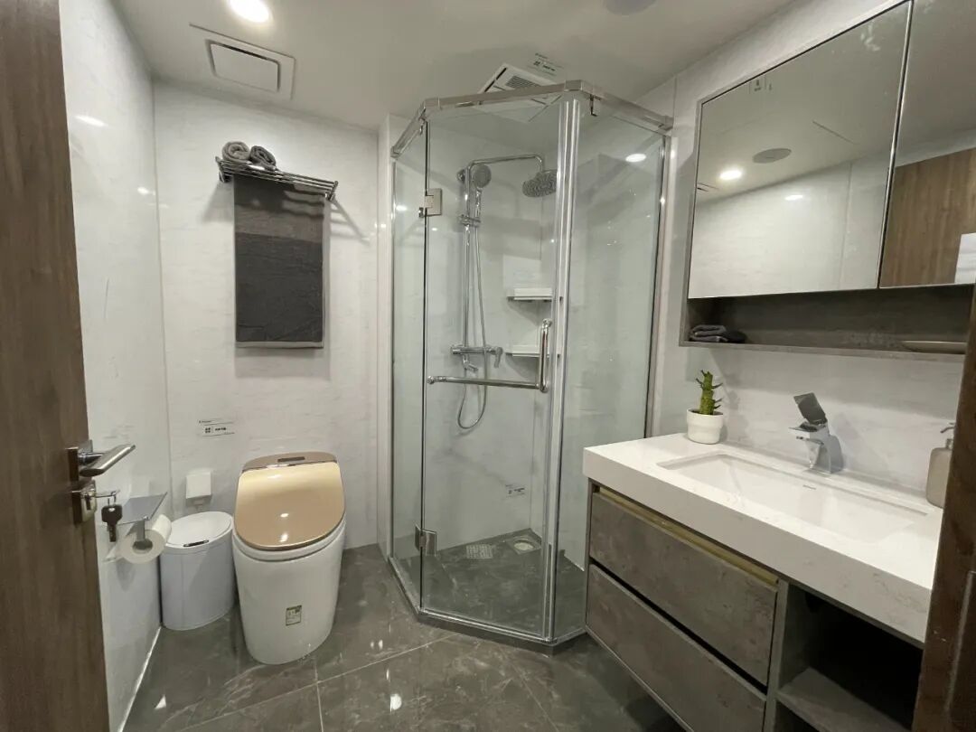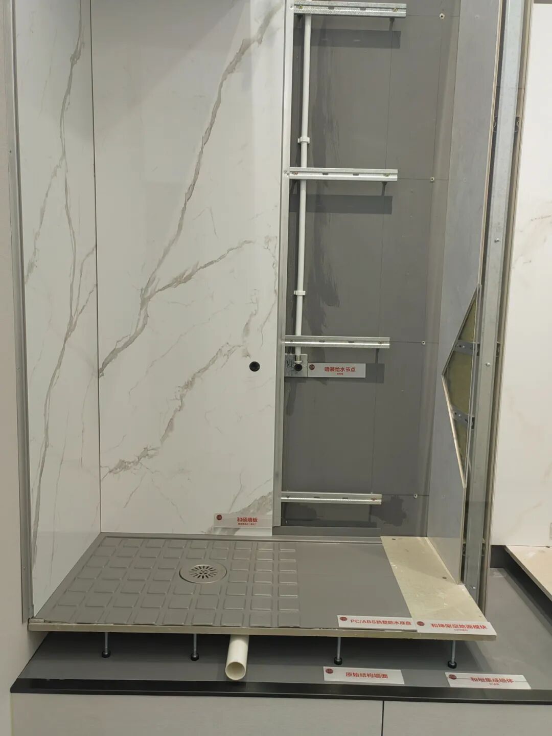 整装卫浴的设计,将卫浴整体化设计,采用一体化防水底盘或防水底盘组合(施工时不需做基础处理和防水处理),与壁板、顶板构成整体空间,配套各种功能洁具形成的独立卫生单元,在有限空间内实现盥洗、如厕、沐浴、收纳等多种功能,如图3、图4所示。具有质量可靠,防水防渗、安装便捷、整体风格统一等特点。整装卫浴将现代化的设计理念与传统卫生间的实用性、功能性、美观性相结合,以工程模块化生产、安装,实现极速安装的快速干法施工,极大缩短施工周期,节约劳动成本,有利于装修住宅交付验收。