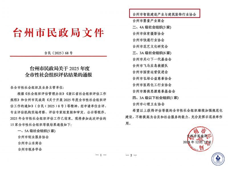 近日,台州市民政局正式公布2025年度全市性社会组织评估等级结果,台州市智能建造产业与建筑装饰行业协会凭借在创新驱动、行业服务、规范治理及产业引领等方面的综合优异表现,成功获评AAAAA级社会组织称号!