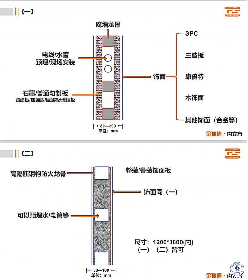 SFQ系列隔墙主要构成为高精度龙骨、芯板为石墨/普通匀质板,SPC/玻镁板/硅酸钙装饰面板。隔墙标准尺寸为高度 2 4 0 0 -3 0 0 0 ,宽度 600mm/900mm/1200mm;