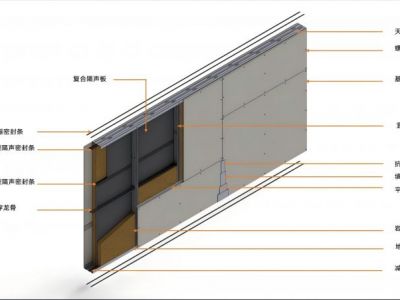 装配式高隔声隔墙系统是以双空腔竖龙骨、天地龙骨、加强横龙骨、贯穿龙骨形成龙骨隔墙架构,内部插装复合隔声板构成多空腔多功能隔声构造,双面封装单层或双层基层板,接缝处采用接缝纸带及嵌缝膏进行接缝,表面可进行多样装饰处理或直接干挂装饰墙板,构成墙体、管线、装饰一体化非承重装配式加强型高隔声隔墙系统。该系统整体结构为标准化的装配式结构,预设管线孔方便了水管、线管的铺设,有效解决了线盒安装、窜声等问题;具有高隔声、防火、环保、抗震减振、自重轻、标准化程度高、施工效率快、免管线开槽等特点。